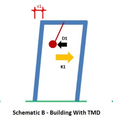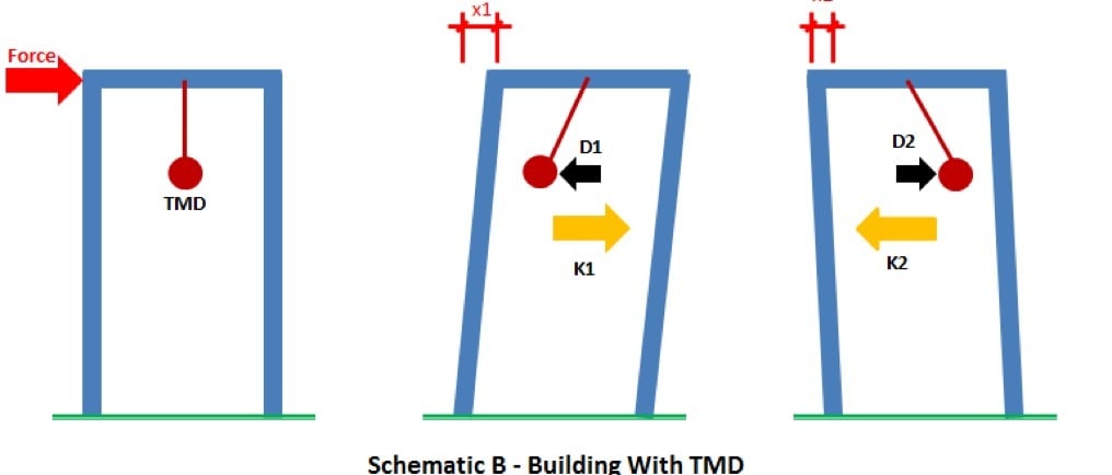 Lorsqu’une structure vibre à une certaine fréquence (par exemple à cause d’un terrain irrégulier ou d’un vent latéral), le mass damper se met à osciller en opposition de phase.
